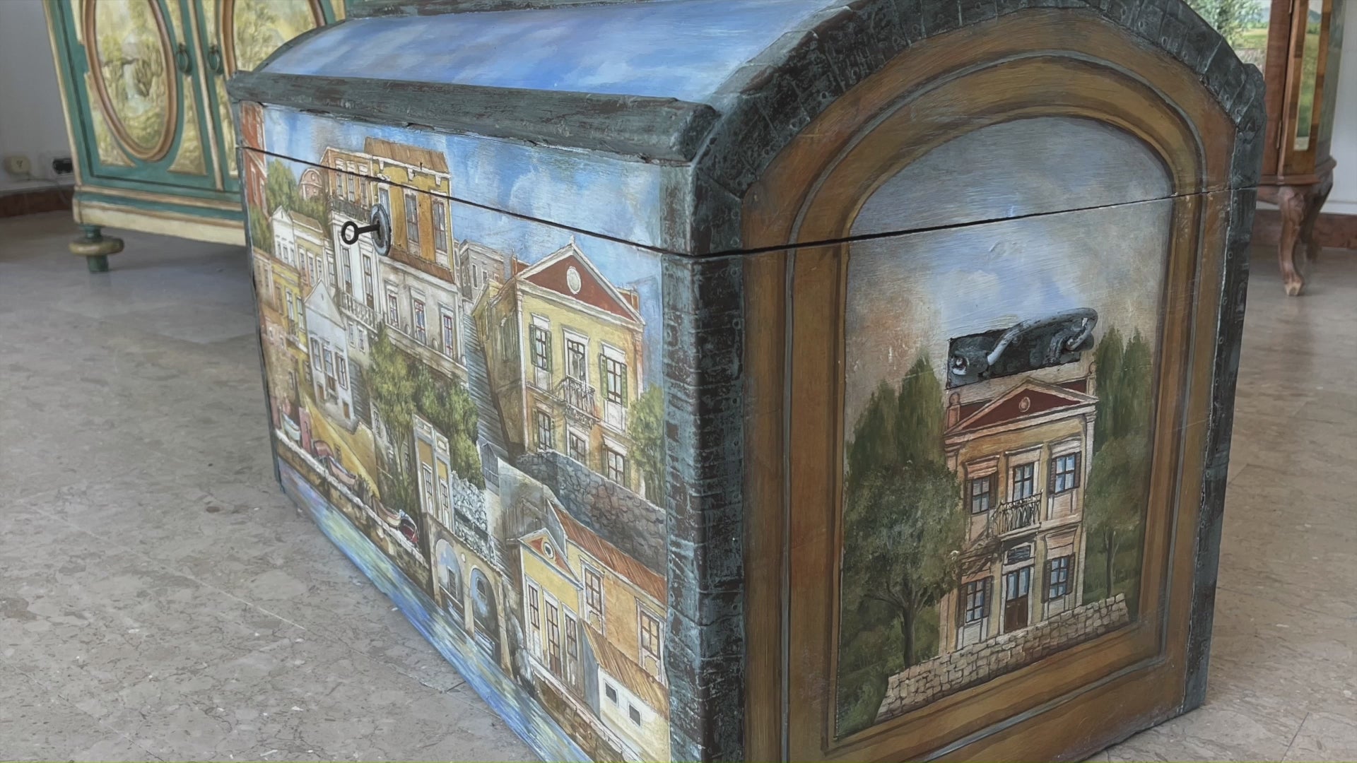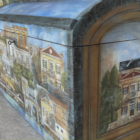 Dipinto a mano, questo baule non è solo un mobile antico ma una creazione artistica irripetibile, in cui i colori e le pennellate raccontano nostalgie piene di luce, vita e speranza. Un invito a lasciarsi trasportare nel prossimo viaggio, sia con la mente che con il cuore.
